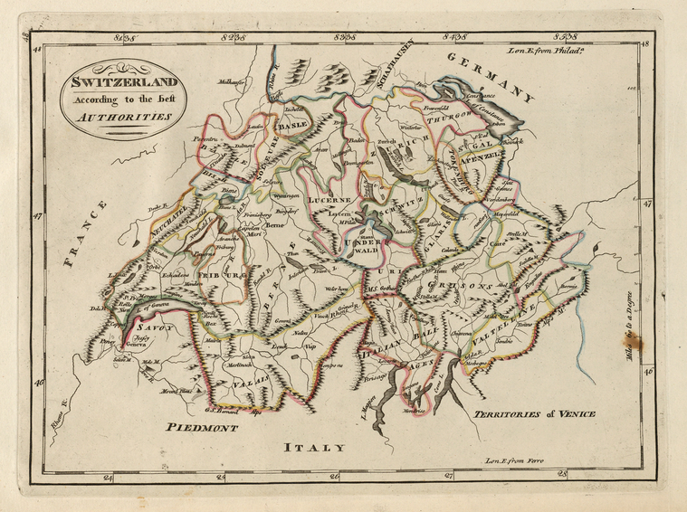 Die Karten zeigen mehrheitlich Regionen in den USA wie z.B. Kalifornien im Jahr 1860 oder alte Stadtpläne von New York. Es sind aber auch historische Karten aus Europa zu finden – hier z.B. die Schweiz im Jahr 1814.